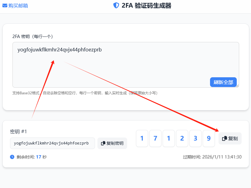 把卡密中第三列的2FA代码复制,粘贴到这个网址的输入框内,获取对应的验证码(对应第二张图)